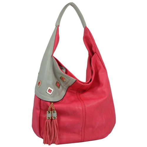 This oversized, smooth leather-like textured hobo handbag has designer inspired color block, without the designer price. Not 1, but 2 tassels add a Native American flair to a modern design, with the metal mod squares decor bringing a vintage edge to this shoulder bag. The accent color starts on the front and extends on to the seamless single strap. Sturdy single shoulder strap has sewn in layers providing a padded feel for stylish comfort. Roomy interior provides portable storage for all your other daily necessities such as iPad, tablet or e-reader; large enough even for a small binder for school, documents for work, and magazines to read on long commutes. Inside the tote bag, 2 open pouches, 2 zipper pockets and 1 large pouch for your small accessories. 1 single zippered pocket located on the back side of this shopping hobo provides easy access to your cell phone or keys so you don't have to go digging for them! Keep your items secure with the zipper close top so you can toss the bowler satchel on the desk or in your car worry-free. Carry this stylish shopper tote in any season with confidence and show up your fashion conscious friends - they don't need to know how much you REALLY paid for it. Affordable designer fashion with enviable quality - it'll be our little secret.