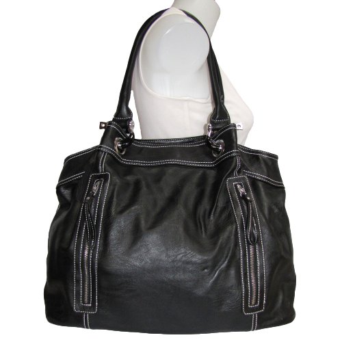 Made from soft textured faux leather. Silver-tone hardware. Dual front zip wall pockets. Back zip wall pocket. Dual carrying handles with over-sized hardware. Zip top closure. Roomy fully lined fabric compartment (Lining colors may vary). Interior zip wall pockets. Cell and sunglass slip pouches. BEFORE PURCHASING, PLEASE COMPARE THE SIZE OF THIS HANDBAG TO ONE OF YOUR OWN FAVORITE BAGS.